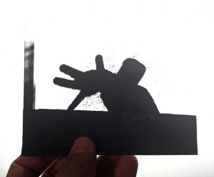 Then I got my friend Myron Young, who posed on a ledge near my house, hanging off the edge. The challenge: how do you combine these two impossible shots into one image? The secret was Kodalith film — a high-contrast black-and-white film that photographers used to create masks. Everything on the film was either black or white — no grays. Black blocked light, white let it through. Using Kodalith, I could isolate the elements I wanted from each image. Both Images the buildings and the subject were shot on slide film. A positive film. With the positive I was able to project Myron’s image into a Kodalith, below you see my hand holding the actual Kodalith mask I made.